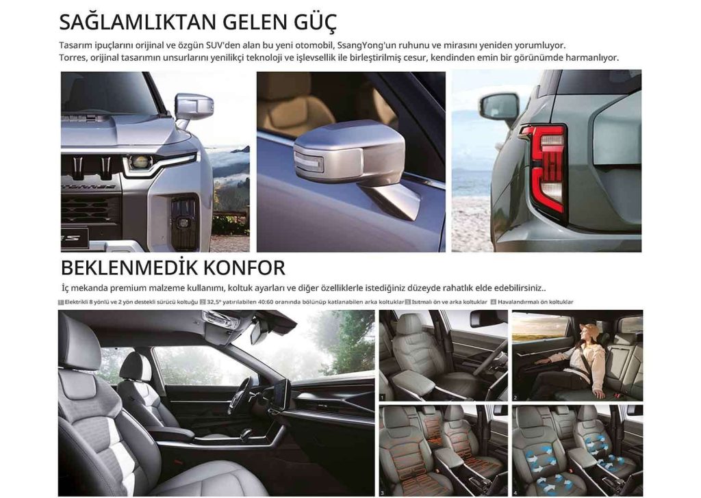Yeni SsangYong Torres, modern SUV anlayışını güçlü tasarım, ileri teknoloji ve üst düzey sürüş konforuyla birleştiriyor. Benzinli turbo motor, geniş iç hacim ve gelişmiş güvenlik sistemleriyle dikkat çeken Torres, 4x2 ve 4x4 olmak üzere iki farklı sürüş seçeneğiyle ihtiyaçlarınıza en uygun çözümü sunar.