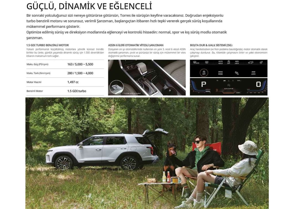 1.5 Turbo Benzinli Motor – 163 HP AWD (4x4) Akıllı Sürüş Sistemi Arazide üstün denge ve çekiş gücü Şerit takip asistanı, adaptif hız sabitleyici gibi ileri güvenlik özellikleri Kablosuz şarj, dokunmatik ekran, çift bölgeli klima gibi premium donanımlar Torres 4x4, SUV deneyimini zirveye taşımak isteyenler için ideal bir seçimdir.